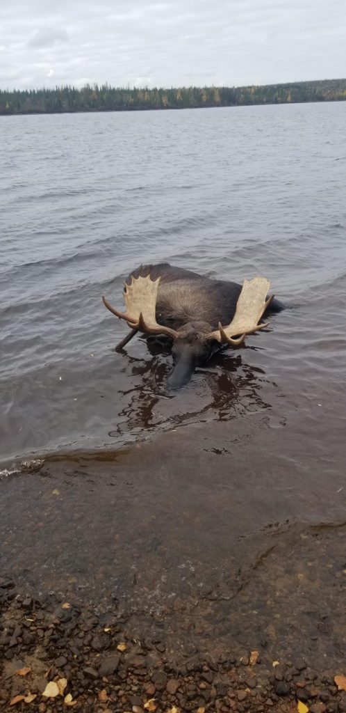 In record time, the opening of our moose season had 1 nice moose down in the first hour. For guide Travis Merasty, it only took one blast of calls to bring a nice trophy down to the water where hunter Doug Hewitt promptly completed the task.